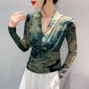 mesh V-neck long sleeved t-shirt for women’s retro floral gauze shirt with a base top